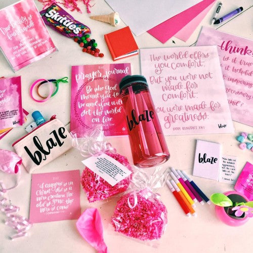 The BLAZE Masterpiece Kit is a comprehensive resource designed to accompany the BLAZE Masterpiece Leader's Guide. It includes all the necessary supplies for leading the sessions effectively. This kit features lesson-based takeaway gifts, truth vs. lie cards, supplies for ice breaker activities, packaging materials, and a BLAZE Masterpiece Prayer Journal. Each girl participating in the program requires one kit, which is shipped to the BLAZE leader. The leader then assembles and distributes the kit components throughout the twenty lessons, enhancing the learning experience and engagement of the participants.